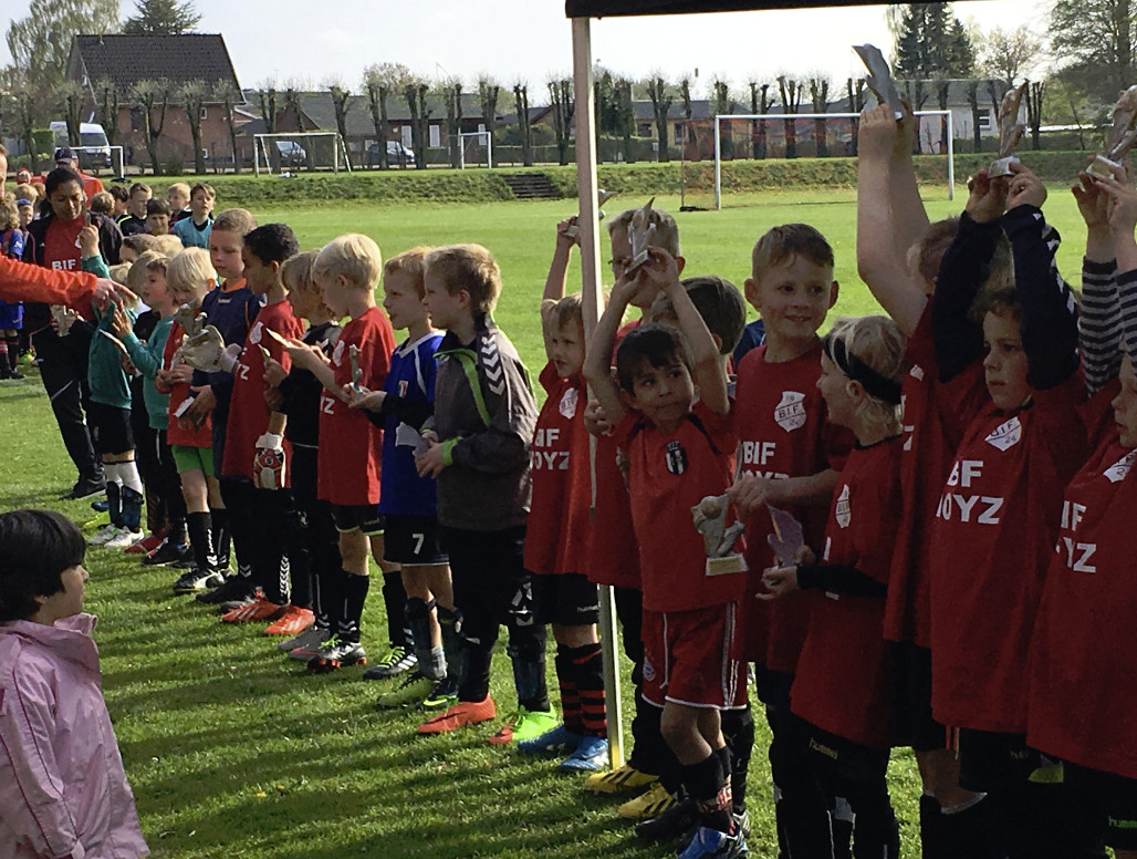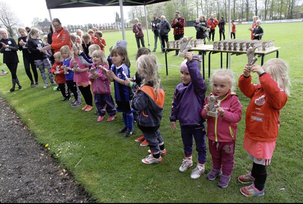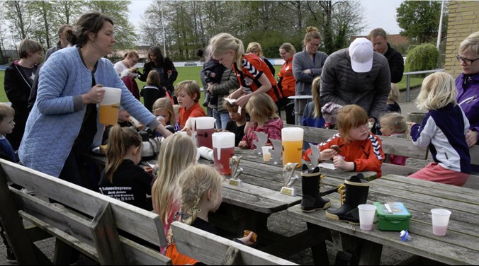 Det er svært allerede nu at sige noget om omfanget af, hvor mange der har valgt at fortsætter med at spille fodbold, men vi mærker en stigende interesse i de yngre årgange til træningen. Sportslig set vil det på længere sigt give flere rigtige gode spillere til klubben, da udviklingen starter i en tidlig alder. En af Brædstrups IF grundlæggende værdier er at få så mange unge som muligt ud og røre sig, og jo yngre jo bedre. På billedet ses nogle af de yngste piger, som var helt ned til 3 års alderen, der deltog i pokaloverrækkelse og drenge som får en velfortjent drikkepause.
